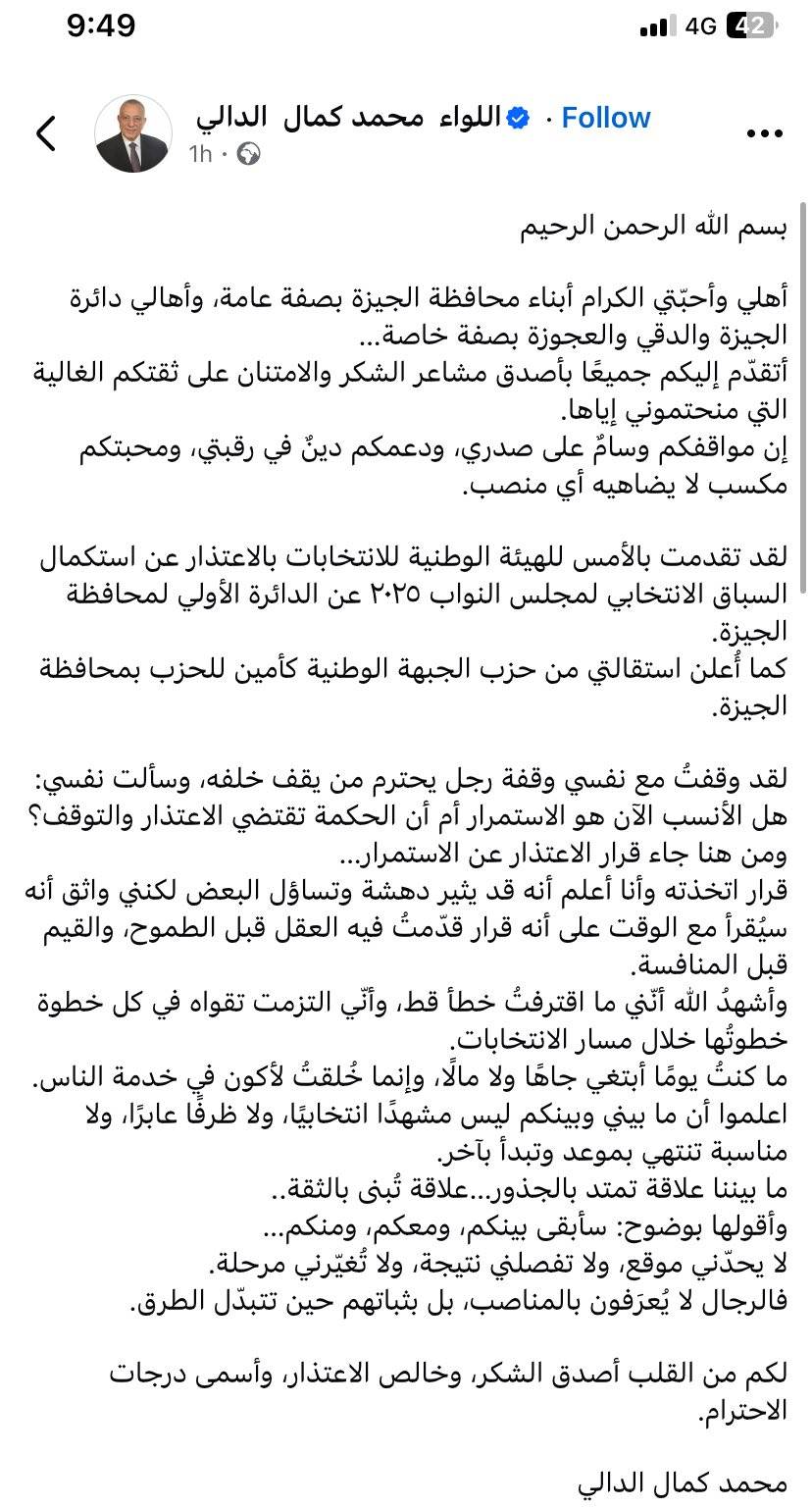 واختتم الدالي بيانه بتوجيه الشكر والامتنان لأهالي الجيزة على ما قدموه له من دعم وثقة، قائلاً: «لكم من القلب أصدق الشكر، وخالص الاعتذار، وأسمى درجات الاحترام»