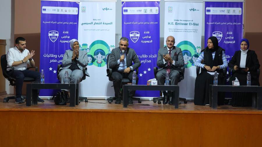 قد تكون صورة ‏‏‏شخص أو أكثر‏، و‏مِنبر‏‏ و‏تحتوي على النص '‏帝 ...دق OYLF S ท้ SD رعاية تحت السيسي انتصار السيدة O.Tئمشgانcنمaرfآقaرية المصرية الأسرة للنهية القومي المشروع اطار مي المصرية المرأة تمكين برنامج إطار في Under the auspices H.E. Entissar E さ SU LEADERS ബമങമ カ00 Within the Framework of the Natio for the Development of he Egypti قادة مدارس الجمهورية و طلاب تحاد a مدارس‏'‏‏