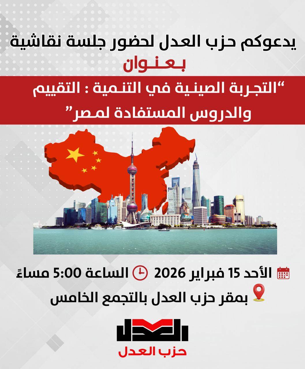 ينظم حزب العدل جلسة نقاشية تحت عنوان "التجربة الصينية في التنمية: التقييم والدروس المستفادة لمصر"، وذلك بحضور عدد من المتخصصين والمهتمين بالشأن الصيني.