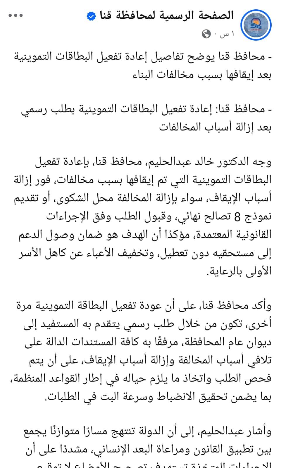 واختتم تصريحاته بالتأكيد على أن الأدوات الرقابية ليست إجراءات شكلية، بل وسائل حقيقية لتصويب المسار الإداري متى اقترنت بالمتابعة الجادة والإرادة الصادقة، وأنه لا يجوز معاقبة المواطن مرتين، ولا يجوز استمرار وقف الدعم بعد تسوية المخالفة قانونًا.