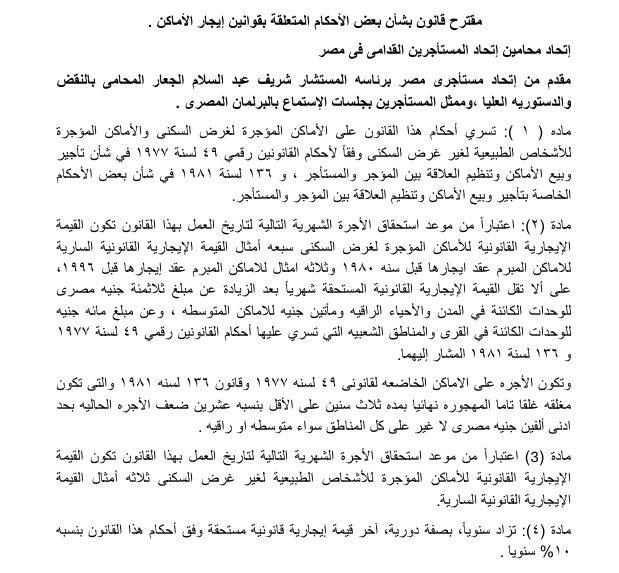 حصل موقع البرلمان على نسخة من مقترح قانون بشأن بعض الأحكام المتعلقة بقوانين إيجار الأماكن المقدم من إتحاد مستأجرى مصر برئاسة المستشار شريف عبد السلام الجعار المحامي بالنقض والدستورية العليا.