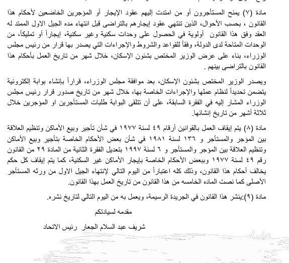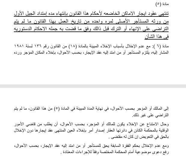 ماده ( ۱ ) تسري أحكام هذا القانون على الأماكن المؤجرة لغرض السكني والأماكن المؤجرة للأشخاص الطبيعية لغير غرض السكنى وفقاً لأحكام القانونين رقمي ٤٩ لسنة ۱۹۷۷ في شأن تأجير وبيع الأماكن وتنظيم العلاقة بين المؤجر والمستأجر ، و ١٣٦ لسنة ۱۹۸۱ في شأن بعض الأحكام الخاصة بتأجير وبيع الأماكن وتنظيم العلاقة بين المؤجر والمستأجر.