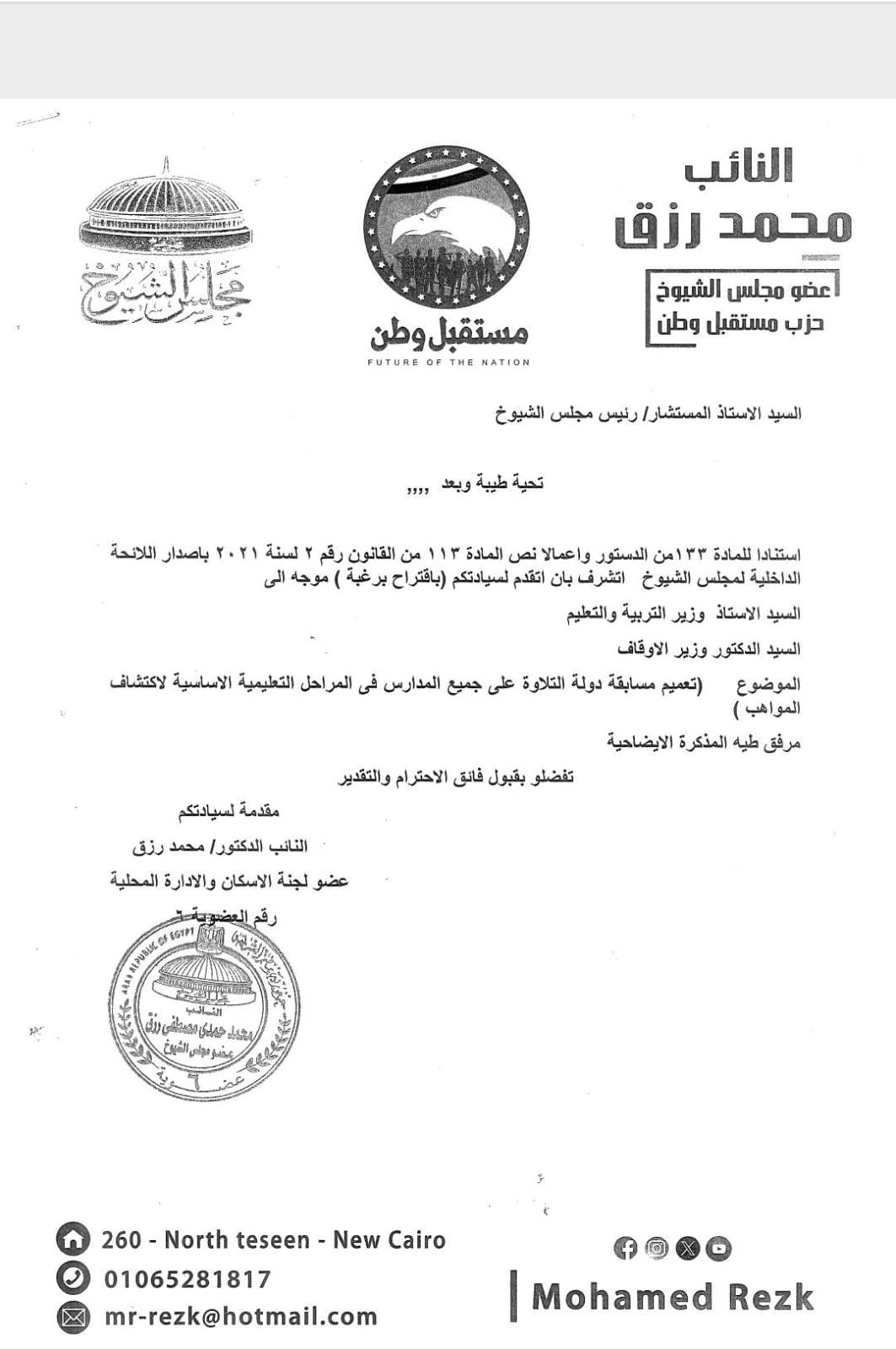 تقدم النائب الدكتور محمد رزق، عضو مجلس الشيوخ، باقتراح برغبة لدراسة تعميم تجربة دولة التلاوة في مدارس التعليم الأساسي، بالتعاون بين وزارتي التربية والتعليم والأوقاف، وذلك بهدف اكتشاف ورعاية مواهب تلاوة القرآن الكريم في مختلف المراحل العمرية، وترسيخ حب القرآن الكريم في نفوس الأبناء منذ الصغر، تحت إشراف متخصصين وعلماء معتمدين.