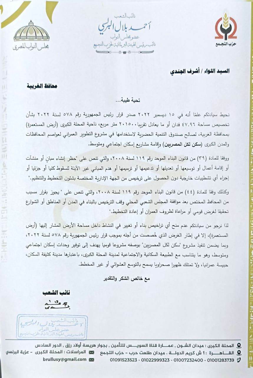 ووجّه النائب خطابًا رسميًا إلى اللواء أشرف الجندي محافظ الغربية، أكد فيه أنه بتاريخ 15 ديسمبر 2022 صدر قرار رئيس الجمهورية رقم 578 لسنة 2022، بشأن تخصيص مساحة 47.96 فدان، بما يعادل تقريبًا 201500 متر مربع، ناحية المحلة الكبرى (أرض المستعمرة) بمحافظة الغربية، لصالح صندوق التنمية الحضرية، لاستخدامها في مشروع التطوير العمراني لعواصم المحافظات والمدن الكبرى «سكن لكل المصريين»، وإقامة مشروعات إسكان اجتماعي ومتوسط.