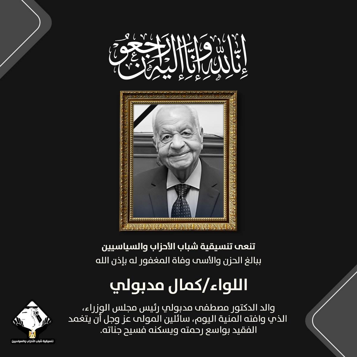 تنسيقية شباب الأحزاب والسياسيين تنعي اللواء كمال مدبولي والد رئيس الوزراء