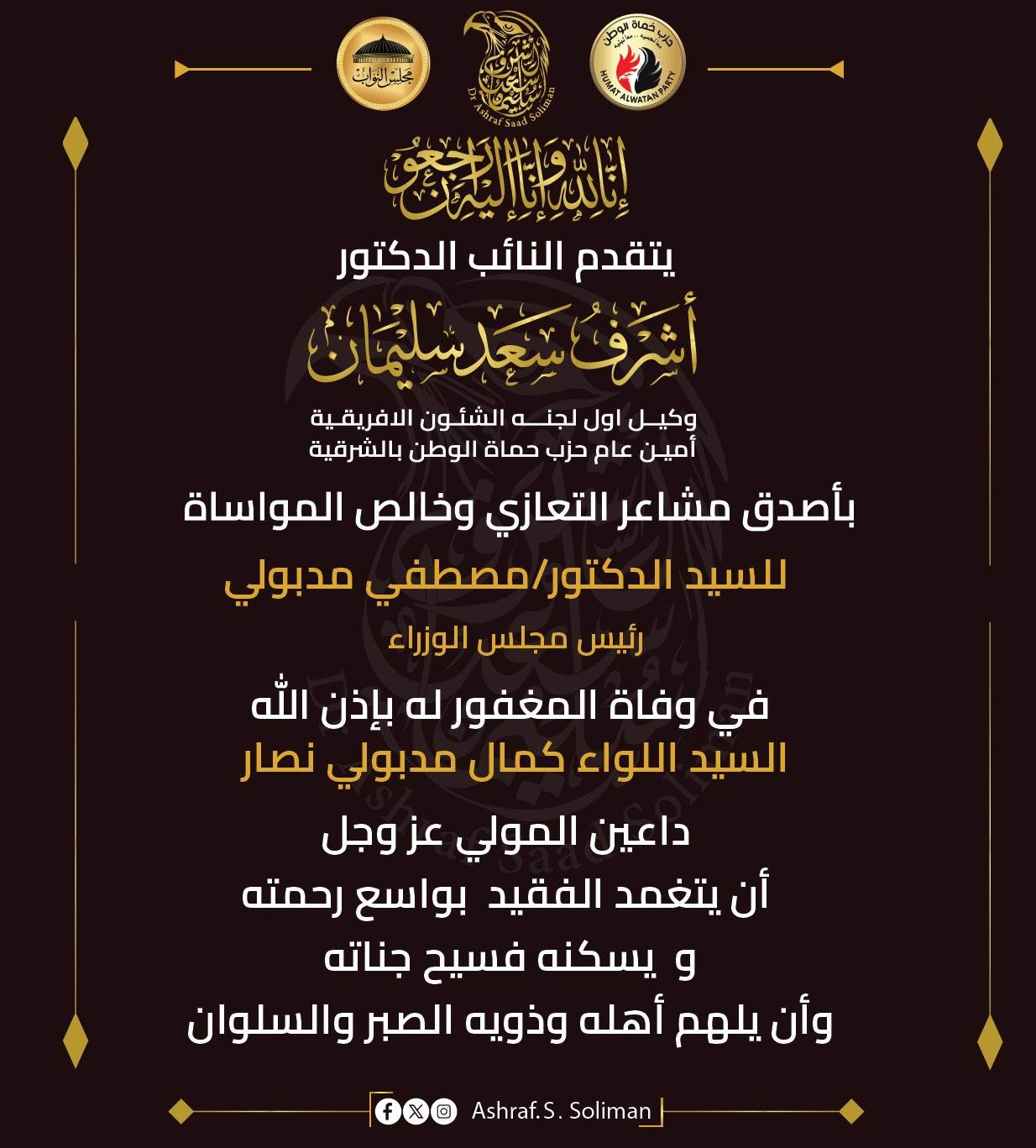 النائب أشرف سعد سليمان ينعى فقيد عائلة مدبولي ويقدم واجب العزاء لرئيس الوزراء
